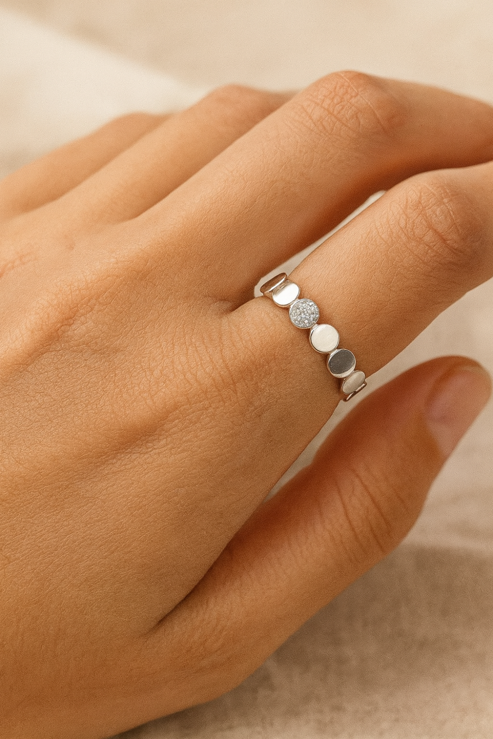 Anillo de Plata 925 con diseño de placas circulares y circones. Una joya moderna y elegante que aporta brillo y sofisticación a cualquier look.