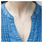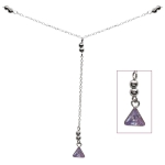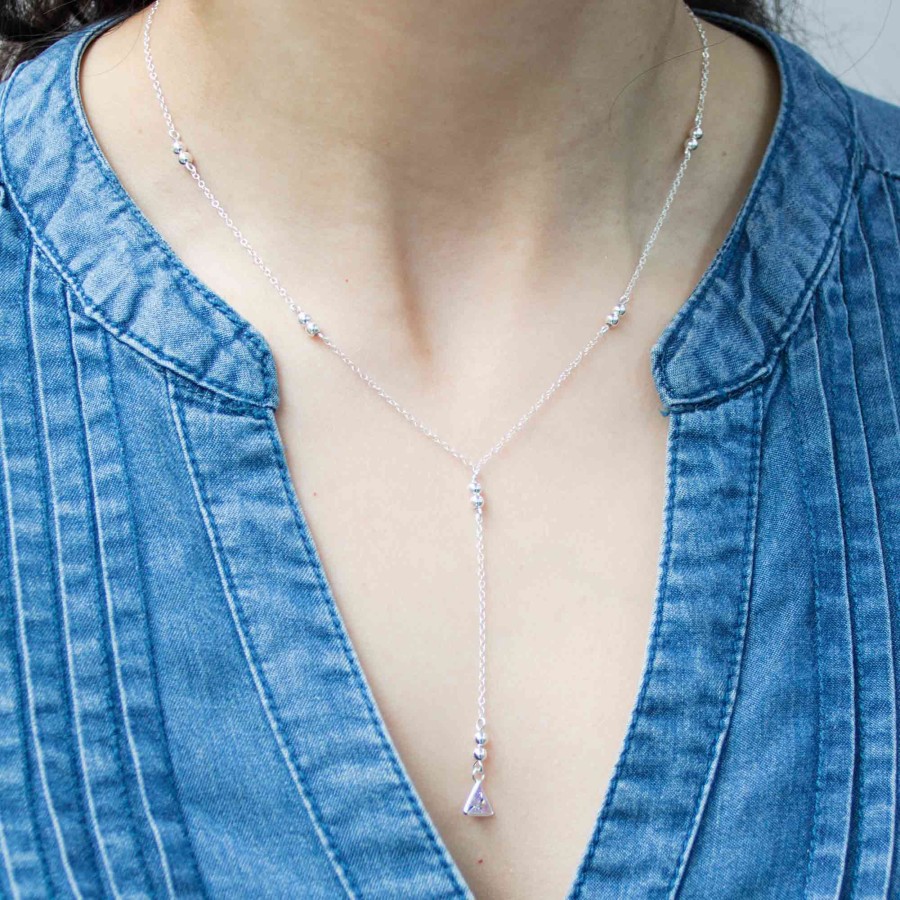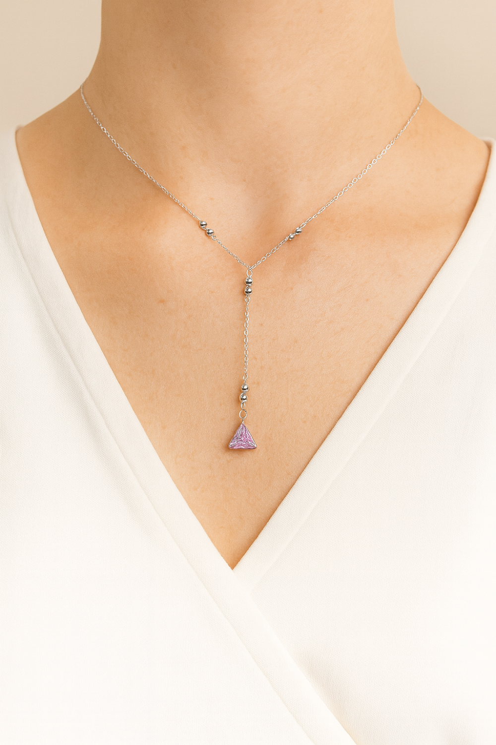 Moderno y delicado, este collar combina esferas y un triángulo adornado con un circón lavanda que aporta un toque de color y elegancia. Perfecto para quienes buscan un accesorio original y lleno de estilo.