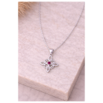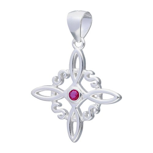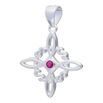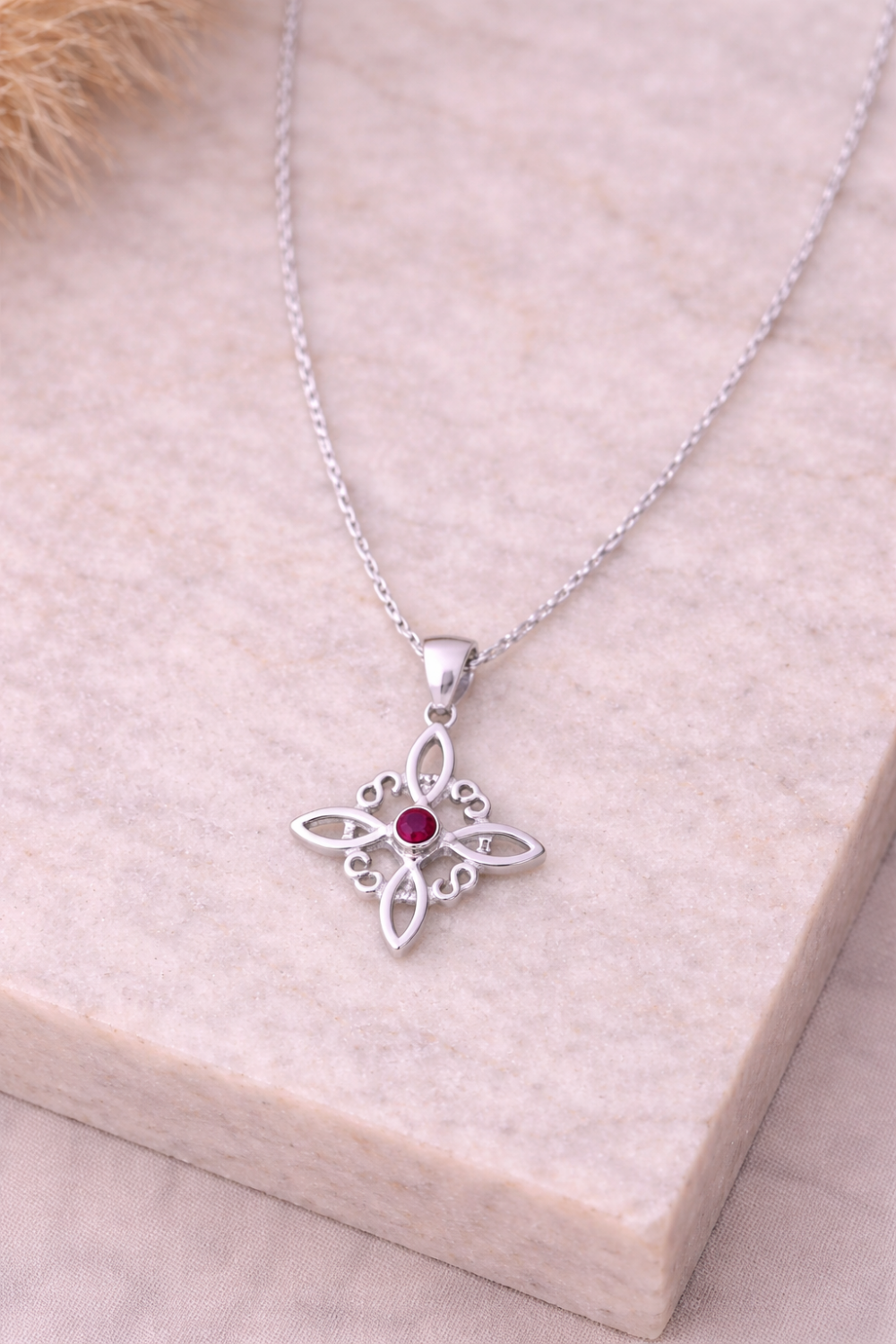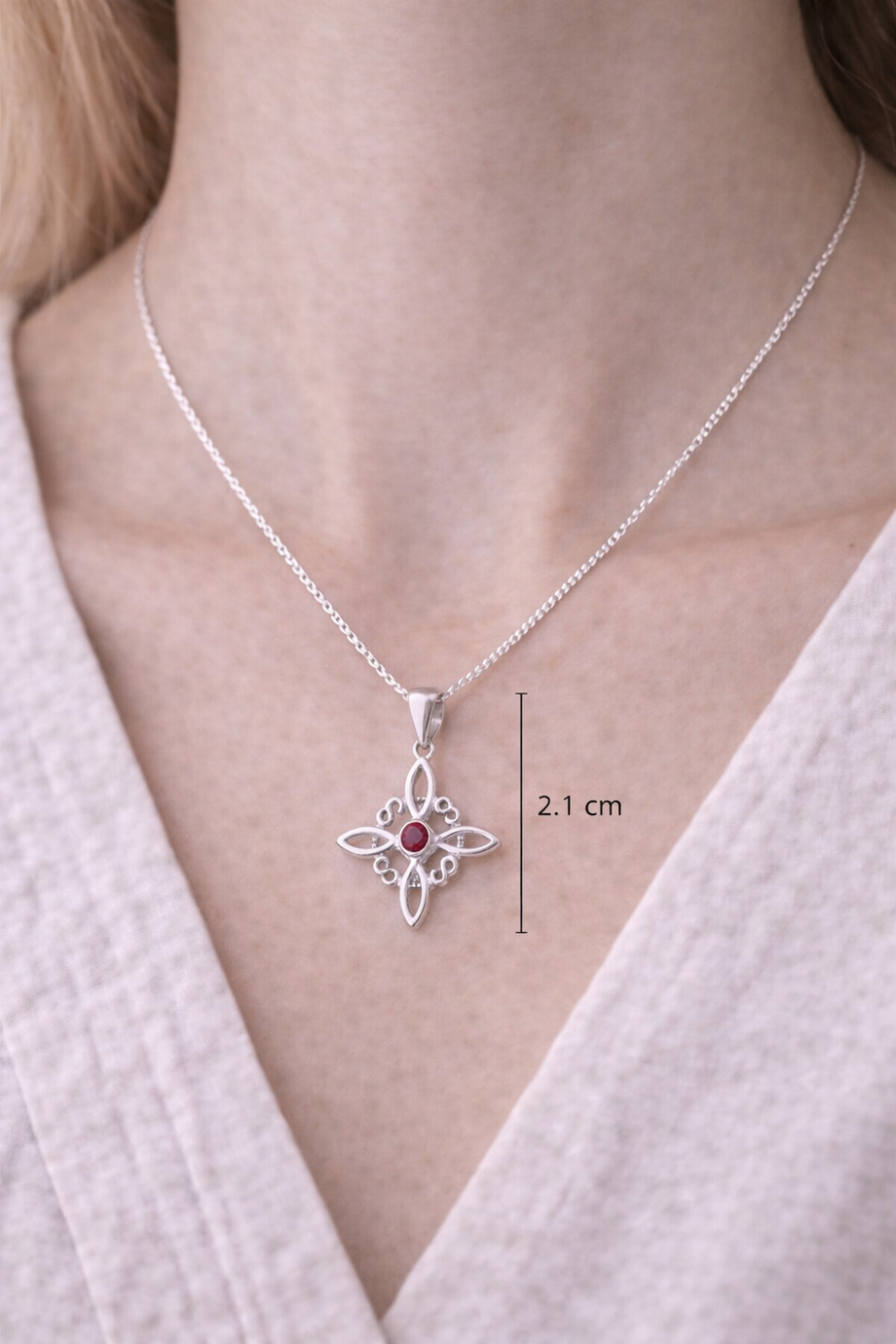 Colgante Nudo de Brujas de Plata 925 con micro circón rubí, acompañado de cadena cobra entorchada de 45 cm. Una joya simbólica, elegante y luminosa.