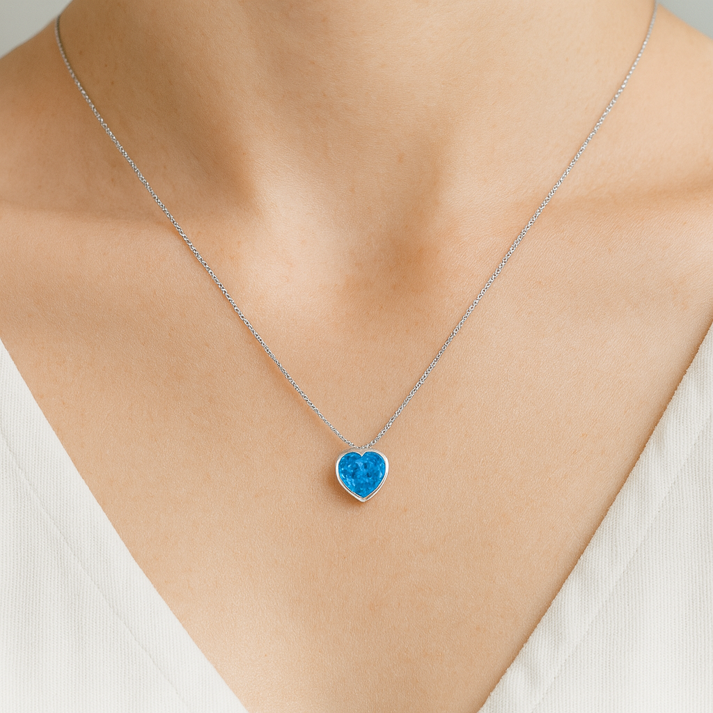 Collar de Plata 925 estilo punto de luz con delicado circón celeste en forma de corazón. Una joya luminosa y sutil, ideal para el uso diario o para regalar.