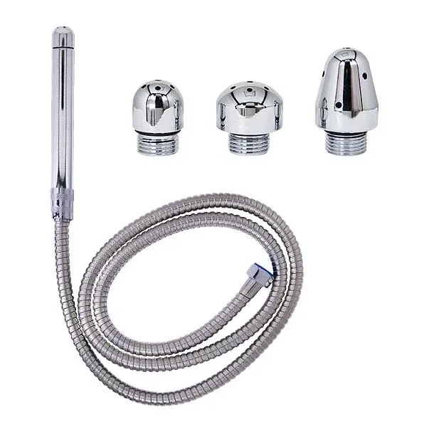 La Ducha Anal Metálica es una manguera de aluminio de 1 metro 45 centímetros con un adaptador universal para la llave de agua, además posee tres cabezales cambiables con orificios para el lavado anal.